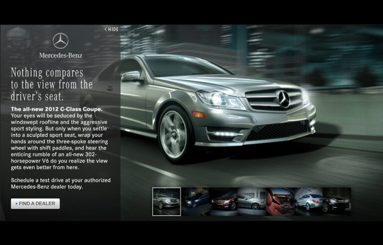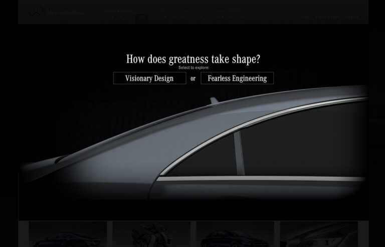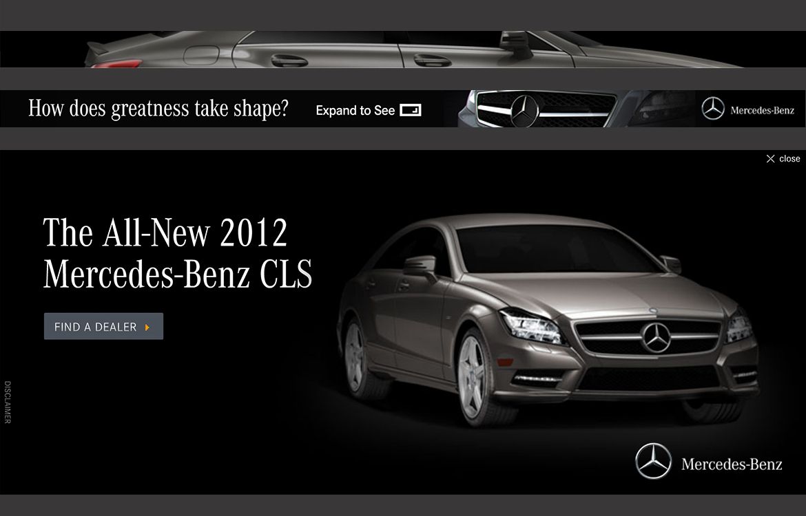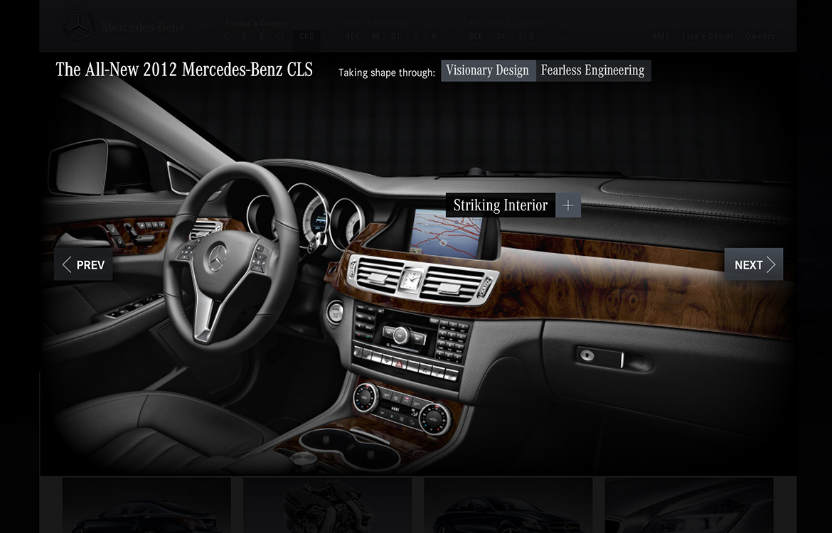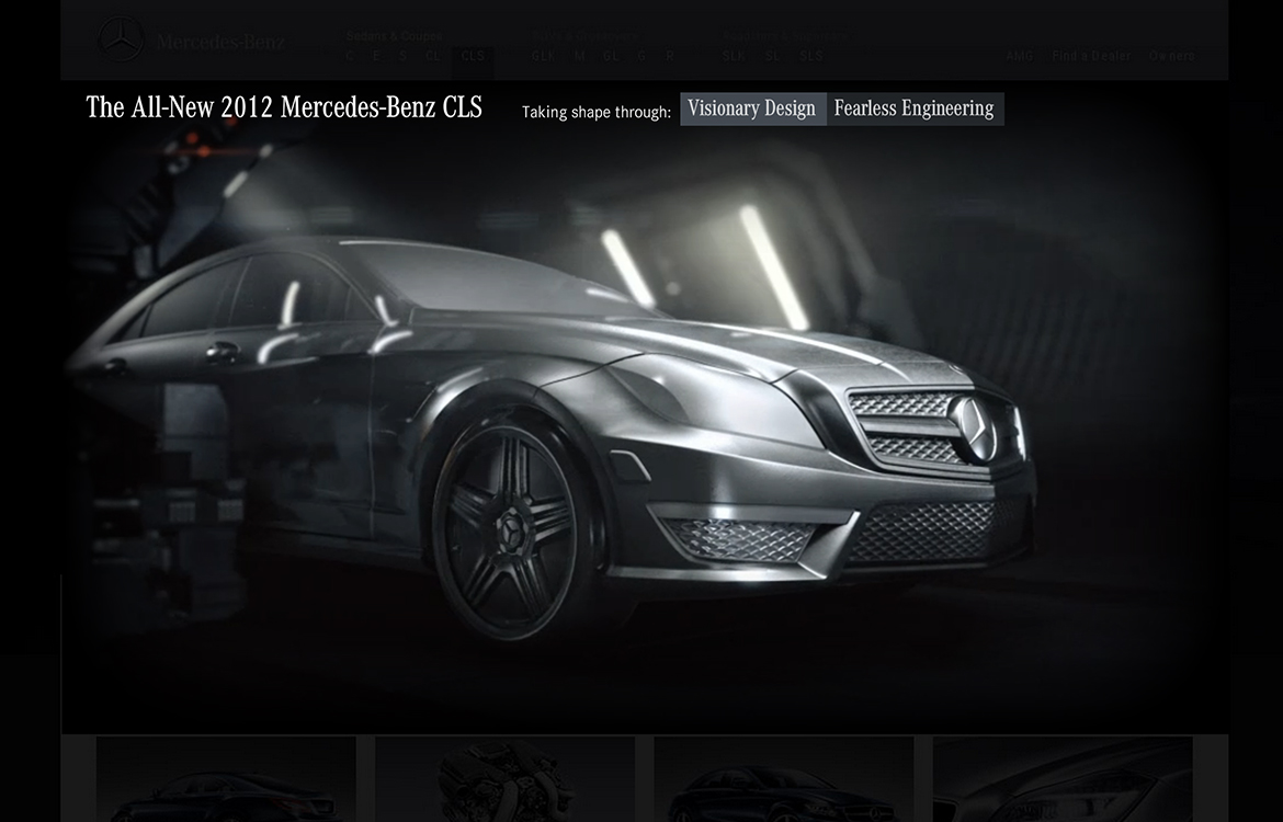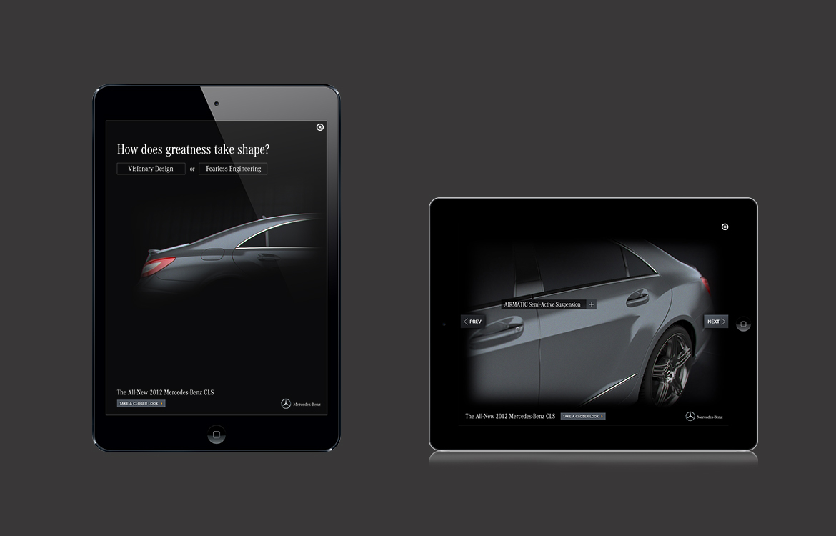 To reveal the new CLS, Mercedes asked us to create something experiential that was visually aligned with the pending TV commercial. We used the TV as a starting point and created our own 3D project extending the reveal into a realtime video fly-through of the car allowing the user to control the path of the camera. We also created a series of Ads that highlighted the curves and details of the car.